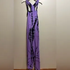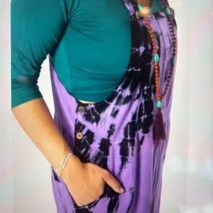 Purple tie-dye jumpsuit. Shorted I am 5’1”. Soft, breathable fabric for comfortable all-day wear. Functional side pockets and adjustable straps for practical styling. Bold black tie-dye accents add a modern, eye-catching look.