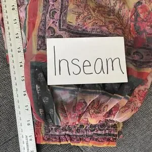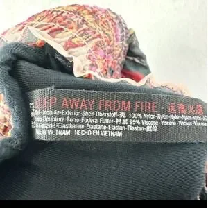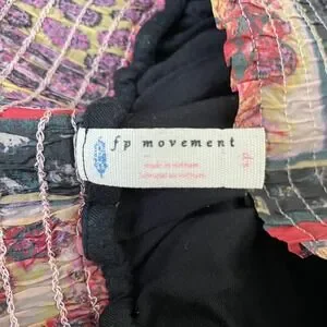 Lightweight joggers from FP Movement feature a vibrant, multi-color patchwork floral and paisley print. Designed with a comfortable elastic waistband and matching cuffs, these pants offer a relaxed, tapered silhouette. The interior is lined with a soft black viscose-blend fabric for coverage and comfort. Note that there are bleach-like stains and discoloration on the interior lining as shown in the photos as well as some discoloration on the outside that is not noticeable due to the busy print. The garment tag is also worn out but I found an image online. The brand tag is intact. They are made up of Nylon, Viscose and Elastane.