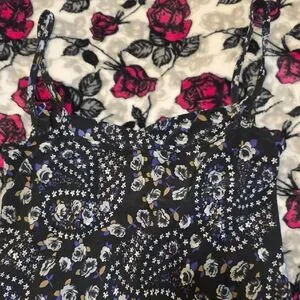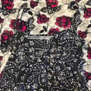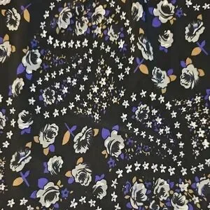 Stylish dress with a floral paisley print. Features a mix of black, white, and blue colors.
