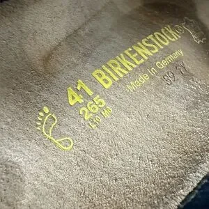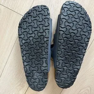 Stylish Birkenstock sandals with three dark blue straps. Perfect for casual wear.