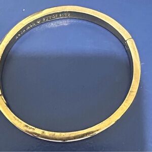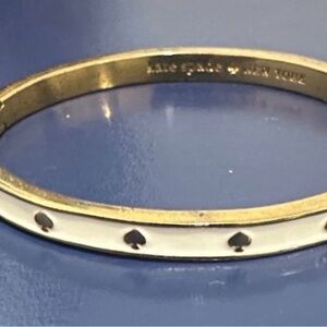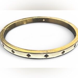 Elegant bracelet with gold finish. White accents and spade motifs. Perfect for any style. Chic gold tone and white Kate Spade bangle with engraved logo. This item is marked, has scratches and minor discoloration but in good used condition.