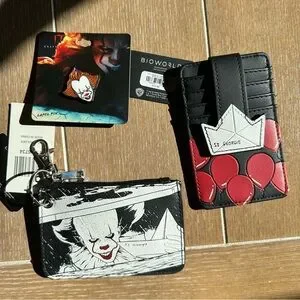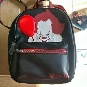 Bioworld mini backpack with Pennywise character graphic and red balloon accent. Front zip pocket and adjustable straps. Includes matching cardholders and lapel pin. Faux-leather exterior with bold printed details.