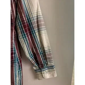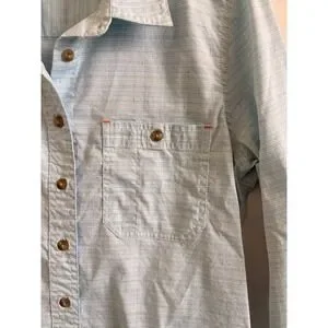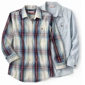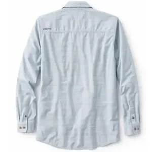 Orvis button-down shirts offer a versatile addition to any outdoor or casual wardrobe. This set includes two long-sleeve tops: one featuring a vibrant multi-color plaid pattern in shades of burgundy, teal, and cream, and the other a subtle light blue textured stripe. Both shirts are designed with a classic pointed collar, a single chest pocket, and a curved hemline for a polished look whether tucked or untucked. Crafted from breathable cotton-blend fabrics, they provide comfort and durability for everyday wear and are perfect lightweight outdoor shirts for hiking, travel, and fly fishing.