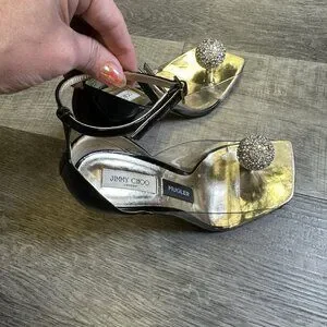 Elevate your style with these designer heels — a standout Jimmy Choo x Mugler collaboration featuring sparkling rhinestone crystal balls, transparent PVC panels, and a sleek black patent leather ankle strap. These evening sandals are perfect for formal events, parties, or red carpet moments.