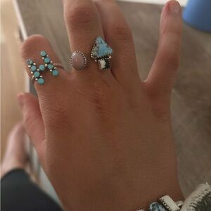 Sterling silver rings featuring turquoise and white stones. Stylish stacking design that highlights the sky-blue turquoise color. Lightweight, wearable pieces for everyday or special occasions. Clean silver accents enhance the turquoise and white tones.