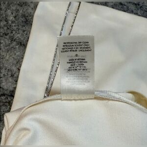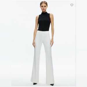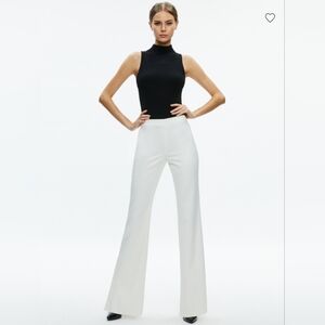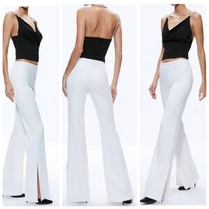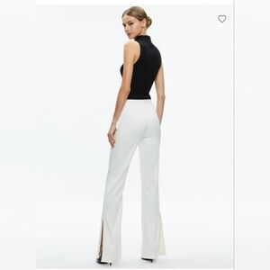 The Alice + Olivia Lara Rhinestone Wide Leg Side Slits Pant in size 6 is a stylish and elegant pair of women's dress pants. Featuring a flattering bootcut leg style and side slit detailing, these creamy white pants offer a chic and modern look. The rhinestone embellishments add a touch of glamour, making them perfect for a variety of dressy occasions. Made by the popular brand Alice + Olivia, these pants are sure to be a versatile and eye-catching addition to any clothing collection.