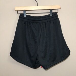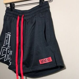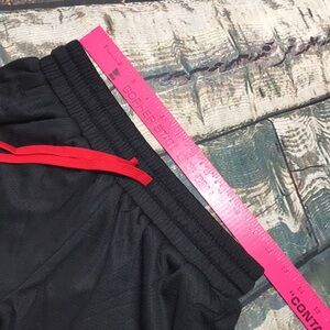 Stylish black shorts featuring bold red accents and graphic text.