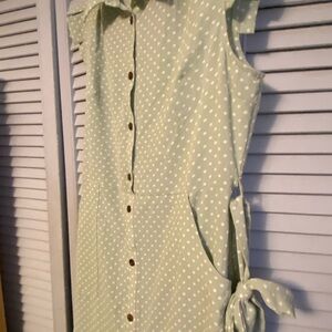 Sleeveless button-front midi dress with white polka dots. Features a tie at the side waist for a custom fit. Soft, lightweight fabric (rayon ) new without tags