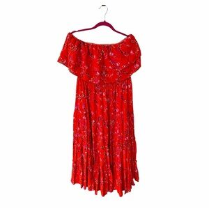 MSK XL Red Floral Off Shoulder Ruffle Midi Dress Boho NWT