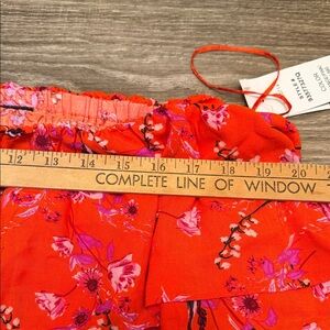 Beautiful MSK off-the-shoulder floral dress in a vibrant red/orange tone with pink floral print. Features a romantic ruffle neckline, elastic smocked waist, and tiered flowy skirt for a flattering silhouette.