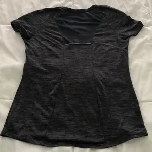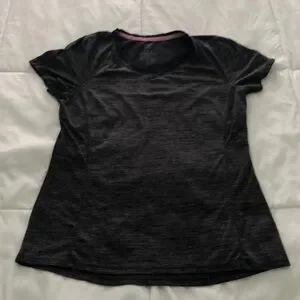 Breathable heathered grey shirt with striping of charcoal mixed with grey. Great for everyday. Gently used