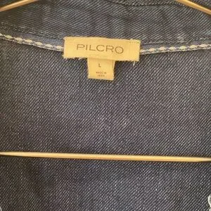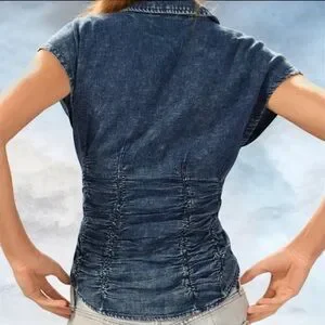 Stylish blue denim top. Button-down front. Short sleeves. Perfect for casual wear.