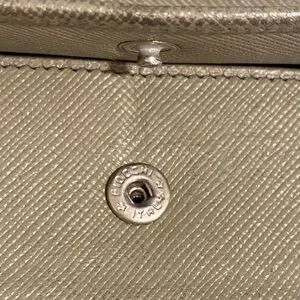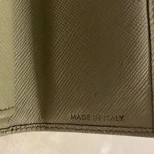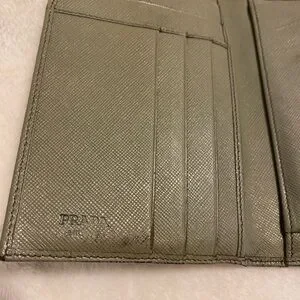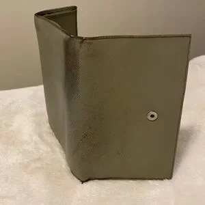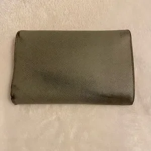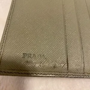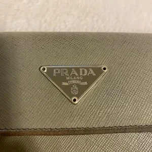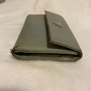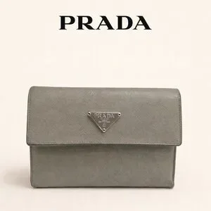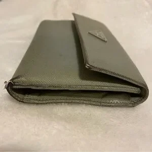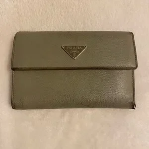 Sophisticated gray leather wallet by Prada. Features iconic logo plaque. Ideal for stylish outings.