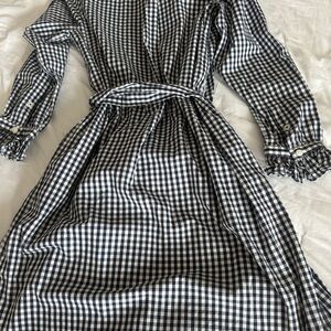 Stylish checkered dress with long sleeves. Features a button-down front and matching belt. Ideal for versatile wear.