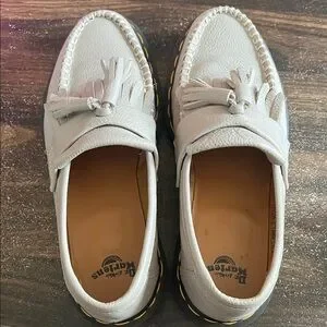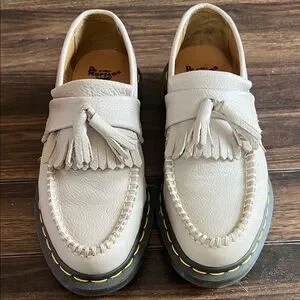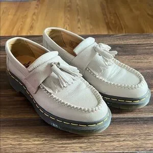 Stylish cream loafers with tassel detail. Durable sole with signature yellow stitching. Perfect for casual wear.