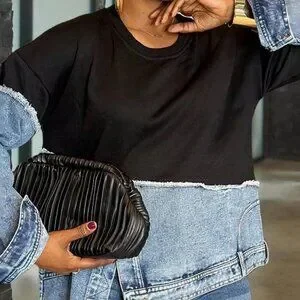 Elevate your late fall style with this black casual Valentine's Day denim patchwork sweatshirt. Made with a comfortable, washed finish, this loose-fit top features a round neck and drop shoulder sleeves for a relaxed look. Perfect for casual wear, its unique denim patchwork design adds a touch of festivity to your wardrobe.