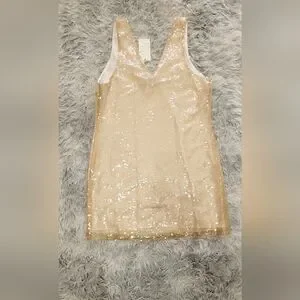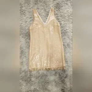 • Easy Pullover Style, Sleeveless, v-neckline, mini silhouette, sequin accents, cream