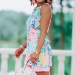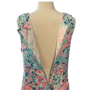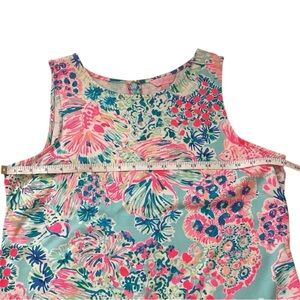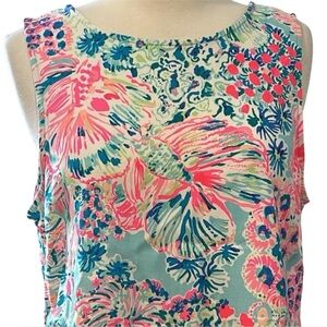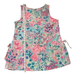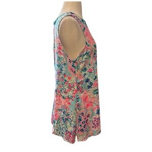 This Lily Pulitzer sleeveless top features a beautiful floral and koi fish pattern in shades of pink and blue, perfect for any casual occasion.