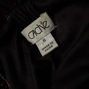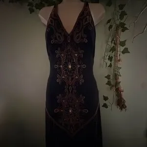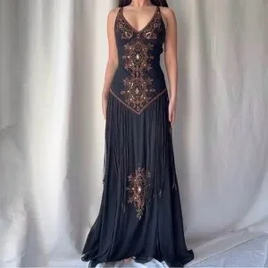 VINTAGE!!! Sleeveless V-neck maxi dress by Cache. Intricate bronze-tone beading and embroidery at bodice and skirt. Flowing skirt with decorative fringe detailing. Elegant, statement evening style.