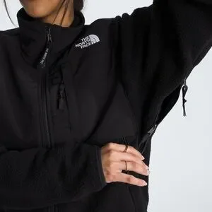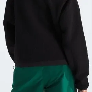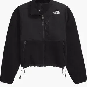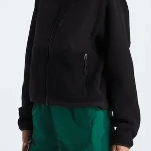 Black sherpa fleece jacket with full zip front. Contrasting smooth chest panel and zippered pockets. Embroidered The North Face logo on chest. Drawcord hem for adjustable fit.
