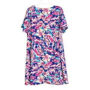 This Aryeh vibrant tropical floral print short sleeve tunic dress resembles the popular Lilly Pulitzer prints and quality! This comfortable dress showcases a lively pattern of exotic flowers and lush leaves in shades of blue, pink, and turquoise. It is a size XL with a stretchy performance type material. Excellent preowned condition, basically looks unused!