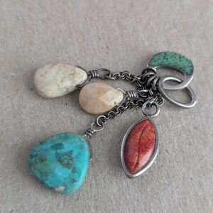 Silpada charm pendant with mixed stone drops. Features a blue-green turquoise teardrop. Includes a reddish coral marquise stone. Paired with two cream-beige stones. Sterling accents and jump rings. Casual, earthy style.