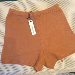 Cozy knit shorts in a warm rust color. Features a drawstring waist for comfort.