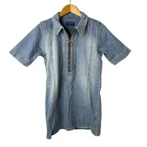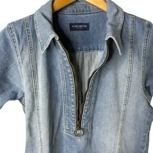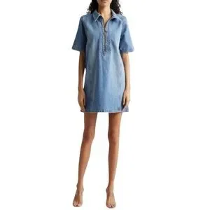 Effortlessly chic Ramy Brook “Tunechi” Denim Mini Shift Dress in a flattering light wash. This modern denim dress features a relaxed shift silhouette, structured collar, and a stylish partial front zip placket with ring pull for a contemporary touch.