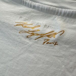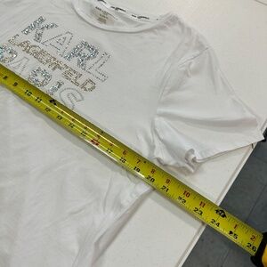 This is an extra large, Karl Lagerfeld Paris, white women's t-shirt. It's in excellent condition, no rips, tears, or stains.
