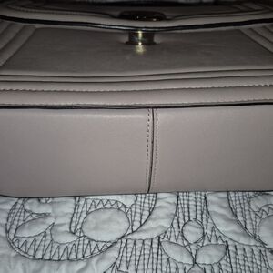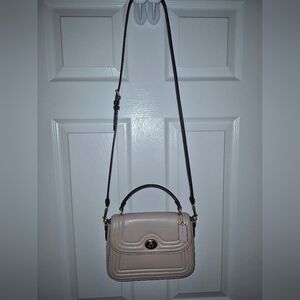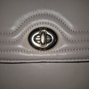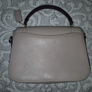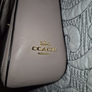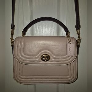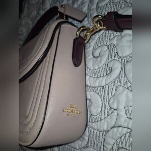 Elegant Coach handbag in a sophisticated mauve color with burgundy handle/strap and gold accents.