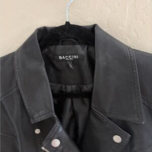 Stylish black leather jacket. Features zippered pockets and sleek design. Perfect for any occasion.