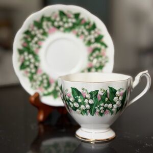 This teacup and saucer set features the vintage "Lily of the Valley" pattern by Queen Anne (England). Known for its delicate white bell-shaped flowers and lush green leaves against a pink-accented background, made of fine bone china.