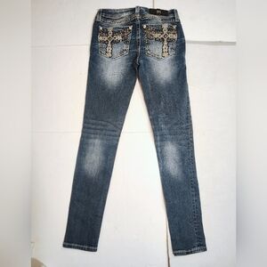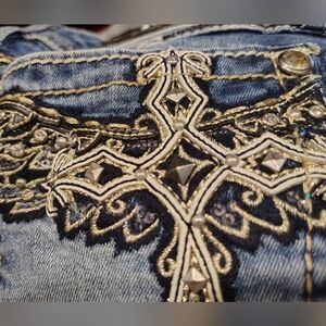 Style and Color: women Cross pocket design , Blue Denim, White Wash, Hailey Skinny, Med Rise, Silver metallic embroidery, jeweled bling