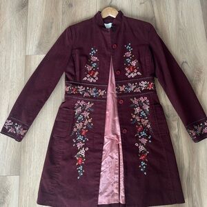 Beautiful embroidered coat from Sleeping on Snow (Anthropologie). This elegant piece features rich burgundy fabric with intricate multicolor floral embroidery throughout the front, waist, and sleeves. Designed with a flattering tailored silhouette, mandarin-style collar, and hidden front closure for a clean, polished look. The soft pink lining adds a lovely contrast and extra detail. Small discoloration on inside lining. Shown in pictures.