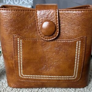 Stylish brown leather crossbody bag featuring a vibrant striped strap. Perfect for everyday use.