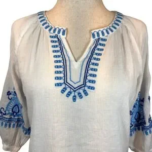 Talbots Gauze Cotton Embroidered Blouse White Blue Boho Peasant Cottagecore PM