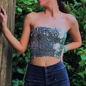 Shimmering sequin tube top from PINK Victoria's Secret. Strapless design with full sequin coverage. Fitted cropped silhouette. Sparkling finish for party wear.