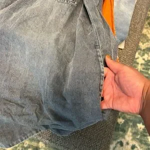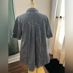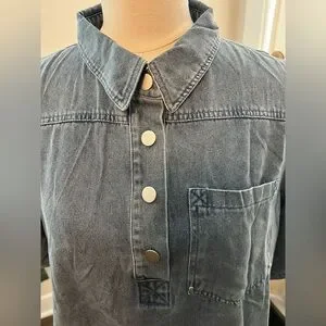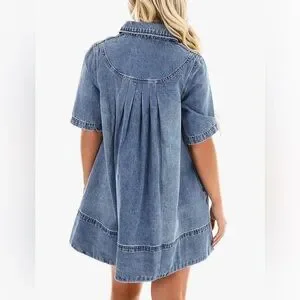 Casual washed blue denim dress with a comfortable polo-style neckline and short sleeves. Soft, relaxed fit designed for easy movement and everyday wear. Classic pocket detail and button placket for a timeless look. Machine washable for easy care.
