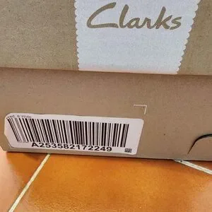 Clarks shoe box in tan color. Simple and elegant design. Burgundy/wine