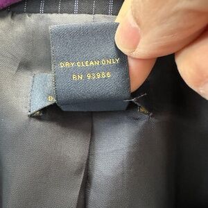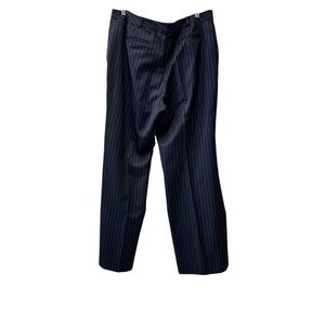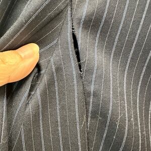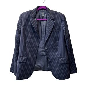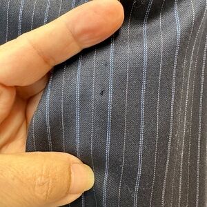 This is a navy blue pinstripe Brooks Brothers 346 Pinstripe, fully lined wool suit. The suit jacket is in a size 14, the fully lined pants are in a size 16. There is one wear mark, and one seam pull. The price is reflecting this.