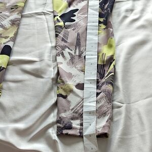 High-waist active leggings with a bold floral abstract pattern. Smooth, stretchy fabric for comfort and movement. Wide waistband for support and a flattering fit. Versatile style for workouts or casual wear.There is pilling at the end of the right leg, as seen in the photo, otherwise in very good condition