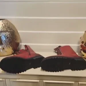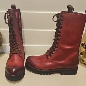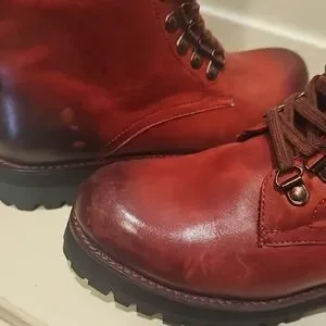 Classic red leather lace-up boots with durable lug soles. Padded footbed and secure lace-up front for comfortable all-day wear. Versatile style pairs with jeans or skirts for a bold look.