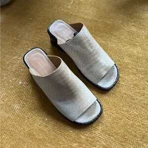Worn twice croc-embossed two-toned Dries Van Noten mules. Open-toe mule silhouette with a stable block heel. Minimal, sculptural profile for polished looks.
