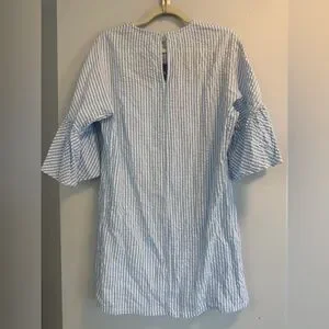 Light blue and white stripe seersucker style mini dress with embroidered flowers and flutter half sleeves