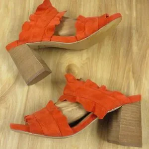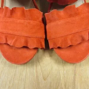 FREE PEOPLE Rosie Ruffle Heels Sz 38 Red Orange Slip On Slide Sandals Block Heel