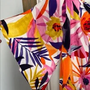 Bold floral maxi with vibrant pink, red, orange and yellow blooms. Short sleeves and flowing skirt create an easy silhouette. Lightweight fabric with lively tropical print. Perfect for warm-weather outings or vacation wear.