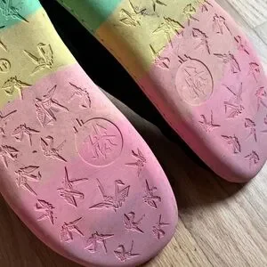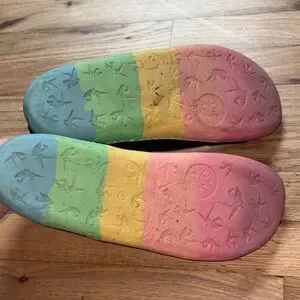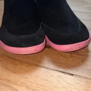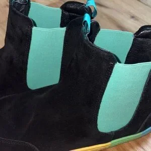 Stylish black suede ankle boots featuring colorful soles and teal accents. These are barefoot soles. If I remember correctly these are by a brand called Paper Crane.