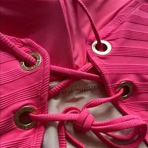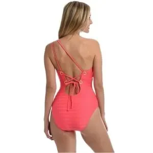 Chic one-shoulder design. Bold pink hue. Ideal for poolside elegance. Has a tie closure in back and removable pads.