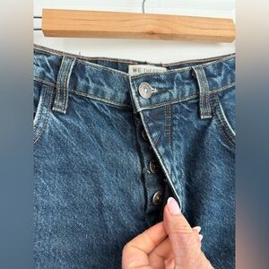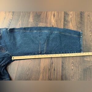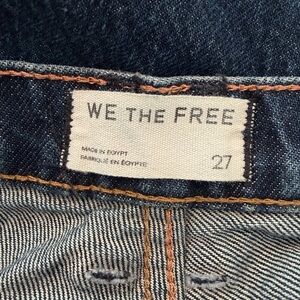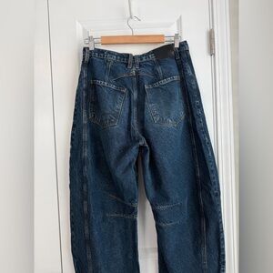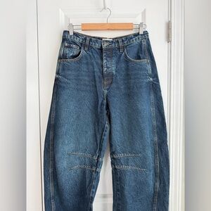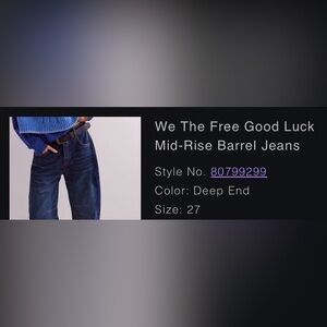 Free People We The Free Good Luck Mid-Rise Barrel Jeans Deep End in Size 27. Purchased directly from Free People and wore once. Too big for my liking, and just never returned. Full disclosure that I did wash and dry these to attempt to get them to shrink some, but I don’t think it made any difference. Super cute. I own other FP barrel jeans and I get complimented any time that I wear them.