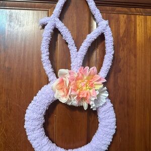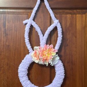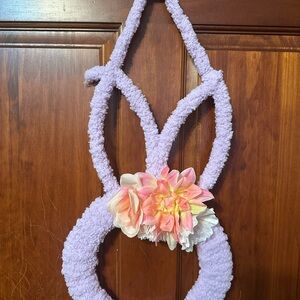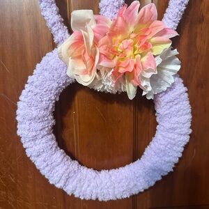 Adorable handmade purple bunny wreath adorned with flowers. Perfect for adding a playful touch to any room.